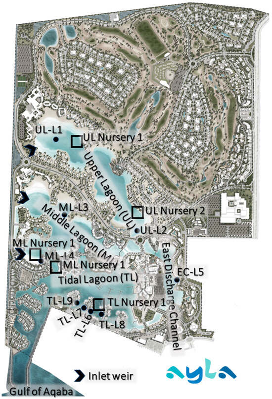 Three artificial inland lagoons, spanning a total area of 750,000 m2, are located strategically within the Ayla project (Figure 1), namely: the Upper Lagoon (UL), Middle Lagoon (UL), and Tidal Lagoon (TL). With these lagoons, Ayla Oasis extended a seafront of 235 m along the Gulf of Aqaba to an additional 17 km of lagoons’ waterfront. The UL and ML are positioned in the north and center of the development, respectively. The UL sits at an elevation of 6.0 m above sea level, while the ML is at an elevation of 3.0 m above sea level. Both lagoons have approximate water volumes of 374,000 m3 and 246,500 m3, respectively, with consistent depths of approximately 1.95 m. TL directly connected to the Gulf of Aqaba (GoA) and maintains a water surface at sea level. It boasts a significantly larger water depth of approximately 5.2 m and a substantial water volume of about 1,525,000 m3.