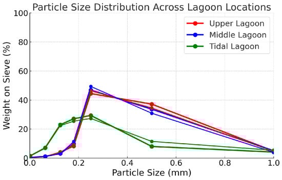 The grain size distribution from the three lagoons implies a sediment distribution pattern in each (Figure 5). The Upper and Middle lagoons show a similar trend with a gradual increase in grain size up to a certain point (0.25 mm), suggesting a mix of fine and coarse sediments with a dominance of medium-sized grains. This could indicate a stable environment with a balanced energy flow capable of supporting a diverse range of sediment sizes.