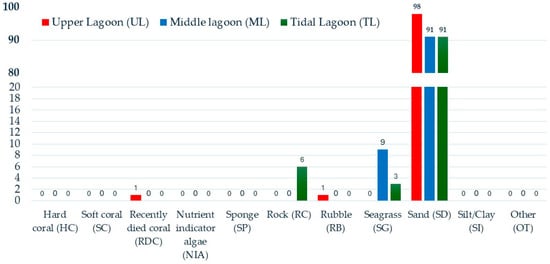 A comprehensive survey of the bottom substrate composition was conducted across various lagoon areas, revealing distinct patterns in substrate types (Figure 6). In the Upper Lagoon, sand overwhelmingly dominates, constituting 98% of the substrate, while the Middle Lagoon displays a similar prevalence of sand (91%) with a minor presence of seagrass. In contrast, the Tidal Lagoon exhibits significant sand coverage (91%), alongside notable rock formations (6%) and seagrass (3%). These findings underscore the varying ecological compositions and habitat complexities across the surveyed areas.