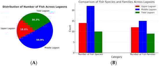 (A) Distribution of fish in Ayla Lagoons, (B) comparison of fish species and families across Ayla Lagoons.