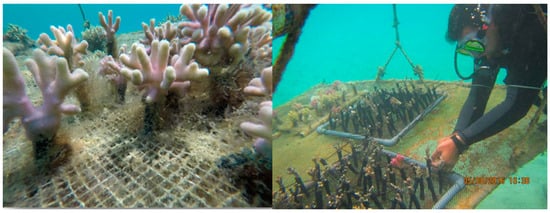 - Nama, S.; Akter, S. Coral Gardening: A novel technique to manage and conserve the degraded coral habitat. Food Sci. Rep. 2021, 2, 50–54. [Google Scholar]
