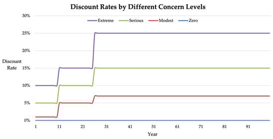 Step function discount rates for four scenarios that represent varying levels of concern of the decision maker about climate change.