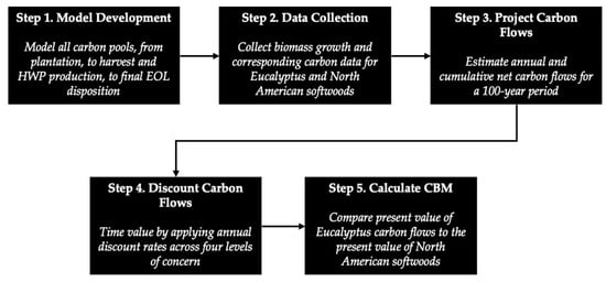 Due to the similarly fast growth and short annual harvest cycle of Eucalyptus compared to other slow-growing wood, we hypothesize that Eucalyptus could have a CBM that is also superior to the North American softwoods commonly used for framing buildings. Our goal is to show the potential carbon removal and storage advantage of Eucalyptus to help advance a decarbonized built environment. The modeling framework was developed (1) to model the annual and cumulative carbon flows and (2) to time value those flows using discount rates that correspond to varying levels of climate change concern. Using the comprehensive CBM metric, we compare the carbon benefits of using Eucalyptus versus US-based softwoods for building products. Section 2 describes the data collection process and modeling framework, Section 3 presents the results of the analyses, and Section 4 discusses the implications of the study and areas of future research.