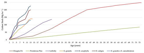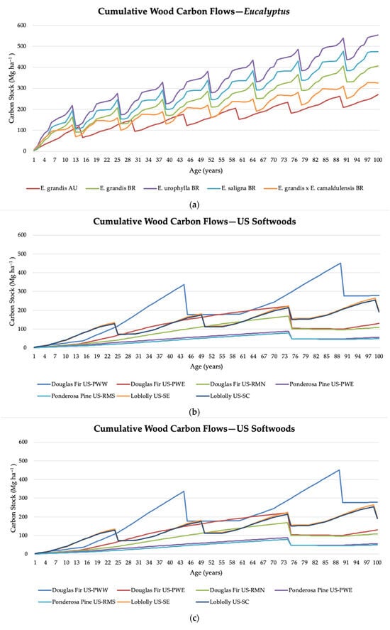 Commercial softwood forestry is well-studied, and published pieces of literature containing models that project the longitudinal carbon flows from softwood plantations are available [,,,,]. However, since Eucalyptus is predominately managed in short rotation cycles for pulp, paper, or energy, the availability of long-rotation data that more closely resemble the harvest management used for structural applications is limited. For long-rotation, longitudinal Eucalyptus plantation-level data, we combined four species for Brazilian-grown Eucalyptus (E. grandis, E. saligna, E. urophylla, and a hybrid of E. grandis x E. camaldulensis) with the single published dataset available for Australian-grown Eucalyptus [,]. In total, five distinct Eucalyptus species-location combinations were analyzed. For the softwoods, three North American coniferous species were analyzed: Douglas fir (the largest growing commercial wood species in North America), Loblolley (the fastest growing and most widely planted commercial species in North America, also known as Southern Yellow Pine), and Ponderosa Pine (a commonly planted and widely used species). Using the USFS’s report [], carbon accumulation data for the three softwood species were selected from six North American locations for a total of seven distinct species-location combinations of wood.