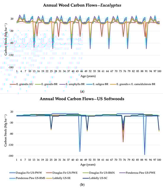 The net annual carbon flows for the Eucalyptus and softwoods, respectively, are presented in Figure 4a,b. For both Eucalyptus and the softwoods, when the lines are above zero, annual carbon sequestration occurs, and when the curve turns negative, the plantation’s harvest waste reemits the sequestered carbon in the year following harvest. Taken together, Figure 4a,b highlight both the large difference in the rotation, or time to harvest, and the larger annual carbon flows for the Eucalyptus species than for the softwood species. Note that the Brazilian Eucalyptus growth data shown in Figure 4a were obtained from a single harvest cycle. The variability in growth year to year is responsible for the spikes in growth prior to harvest. Further research trials would help give more average data and potentially a smoother growth curve.