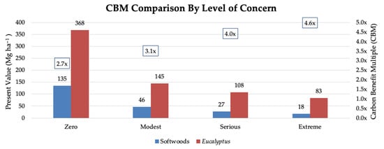 To analyze varying degrees of concern about climate change, four different temporal discount rate scenarios are constructed that progressively weight higher levels of concern (zero, moderate, serious, and extreme) and thus higher discount rates. The resulting CBM for each scenario is a ratio of the present values after discounting the annual carbon flows for the Eucalyptus species compared to the softwood species. This results in a quantification of the relative benefit of Eucalyptus compared to the softwoods in capturing atmospheric carbon to be stored in durable building structures. The scenario-specific CMBs, shown in Figure 6, suggest that Eucalyptus can be 2.7 to 4.6 times more potent in decarbonizing buildings. In the “Modest” to “Extreme” comparisons, the overall effect of time valuing significantly lowers the absolute amounts of carbon sequestration for both Eucalyptus and softwoods. However, across the three “Modest” to “Extreme” levels of concern, the comparative CBM rises in favor of Eucalyptus as the level of concern about climate change (i.e., higher discount rates) increases, highlighting the impact of near-term carbon flows from Eucalyptus.