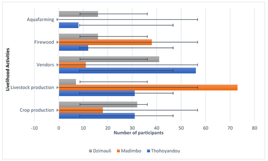 The findings of the study from respondents indicated that crop production (N = 81, 20%) was the dominant activity in Dzimauli (N = 32), while Ṱhohoyanḓou (N = 31), which is relatively similar to this livelihood activity. During the questionnaire session, it was revealed that firewood was also an identified livelihood option with (N = 66, 13%), where it is dominant in Madimbo (N = 38), followed by Dzimauli (N = 16) and Ṱhohoyanḓou (N = 12). Aquafarming (N = 24, 8%) is relatively dominant in Dzimauli (N = 16) and Ṱhohoyanḓou (N = 8), but there were no aquafarming livelihood activities identified in Madimbo.