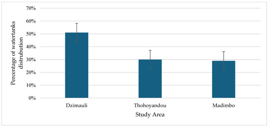 As found during data collection, in all three study sites, Ṱhohoyanḓou, Madimbo, and Dzimauli, the local population depends on water tanks as an evident practice of climate-resilient practice; see Figure 4. The results indicated that the highest establishment of water tanks was in the Madimbo area (51%), as well as 30% and 29% of water tank establishment in the Ṱhohoyanḓou and Dzimauli areas, respectively. During the questionnaire and interview, it was revealed by the population that there are about 875 water tank distribution initiatives that have been coordinated throughout the local municipalities in Dzimauli and Madimbo as a project relating to rainwater harvest through the collaboration of the government and private organizations. The following major stakeholders were involved in managing such programs: (a) the National Department of Water Affairs (b) the National Department of Environmental Affairs and (c) Lushaka Private Limited Company.