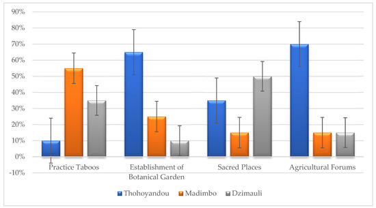 However, the results within the Ṱhohoyanḓou area demonstrated the lowest figures of respondents with only 10% agreeing that taboos seem to assist in the establishment of livelihood engagement in climate change. During an interview concerning knowledge of the botanical garden, it was reported by respondents that the botanical garden was more visible in the Ṱhohoyanḓou site with an estimate of 65%, while the Madimbo site indicated 25%, and Dzimauli site respondents reported 10%, having the least knowledge about the botanical garden. Further, results regarding sacred places were more prevalent in the Dzimauli area at 50%, followed by the Ṱhohoyanḓou area at 35% and the Madimbo area at 15%. The respondents indicated during the interview that sacred places that are regarded as special and traditionally important play a very crucial role in reducing the rate of deforestation and educating people culturally on how important the preservation of the natural environment is.