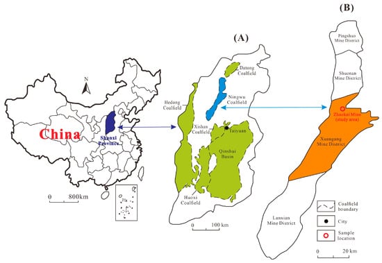 Figure 1). The primary coal-bearing strata in this region consist of the Jurassic Datong Formation, the Carboniferous–Permian Taiyuan Formation, and the Permian Shanxi Formation. The coalfield is segmented into four mining areas: Pingshuo, Shuonan, Xuangang, and Lanxian, extending from the northern to the southern part. The Zhaokai Mine, which is the central subject of this investigation, is situated within the Xuangang Mining Area in the Ningwu Coalfield. The coal resources in this area are abundant and contain trace elements. Studying the geochemical characteristics of coal is crucial to understanding and optimizing its utilization.