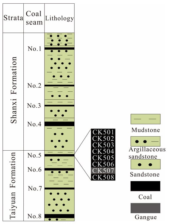 A total of eight specimens from the No. 5 coal seam of the Taiyuan Formation were gathered from the Zhaokai Mine. According to the Chinese GB/T 482-2008 standard [