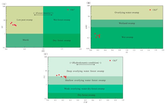 Figure 3A), the samples are classified as originating from a low-peat swamp, suggesting a humid environment with shallow water coverage.