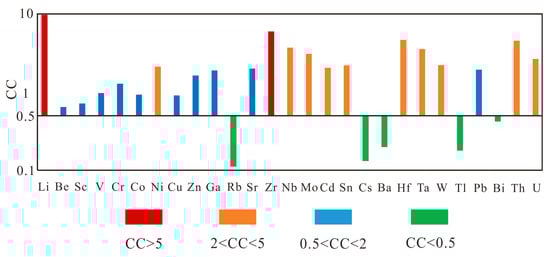 Figure 4, Li and Zr exhibit significant enrichment, while Ni, Nb, Mo, Cd, Sn, Hf, Ta, W, Th, and U show minor enrichment. The enrichment coefficients for Be, Sc, V, Cr, Co, Cu, Zn, Ga, Sr, and Pb fall between 0.5 and 2, indicating a normal range. On the other hand, the enrichment coefficients of Rb, Cs, Ba, Tl, and Bi are all less than 0.5, showing a loss.
