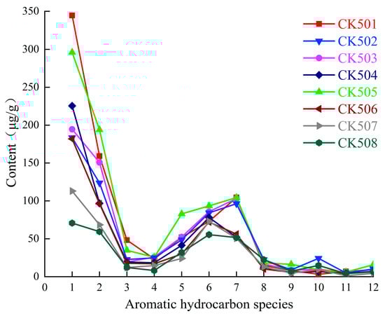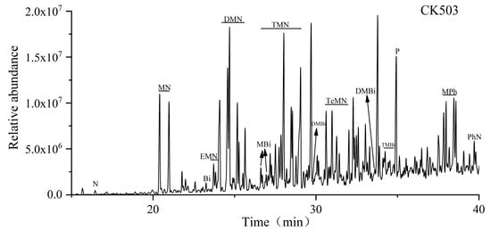 Identified aromatic hydrocarbons of the No. 5 coal in the Zhaokai Mine (μg/g).