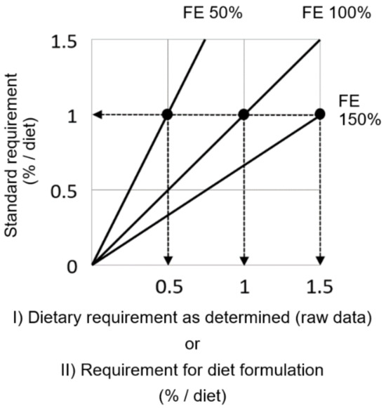 In practice, dietary requirements, typically reported per unit weight of feed, can be normalized by dividing by the FE of that particular diet (or multiplying by the feed conversion ratio, FCR: feed fed/fish weight gain). This adjustment provides the requirement per unit of fish weight gain, which represents the dietary requirement when FE is 100% or 1.0 (Figure 1). This rectification was proposed by Sugiura et al. [47] as the standard requirement or Requirement Coefficient. The standard requirement is universal and can be multiplied by the FE of any diet used in practical feeding; namely, the dietary requirement of a practical diet (g/g feed) = standard requirement (constant) × FE of that diet. This standardization ensures that the requirement value is both accurate and practical. The standard requirement for each nutrient remains constant, regardless of feed composition, fish size, and most culture conditions.