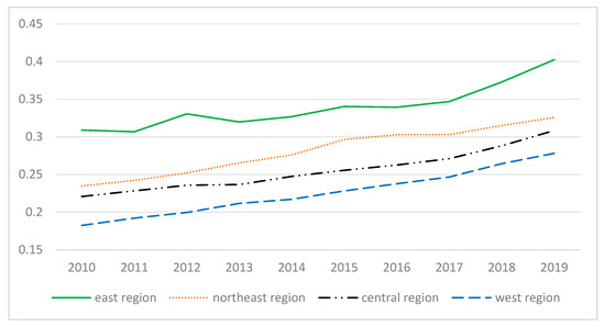 As shown in Figure 2, during the research period, the quality and efficiency of all regions generally increased. The eastern, central, and northeastern regions took the lead alternately, far exceeding the western region. However, the western region headed the other regions with an average annual growth rate of 5%. The northeast experienced a significant decline in 2019, mainly due to the decrease in the output of livestock products and the number of certified green foods. The fluctuation range of coordinated sharing in each region was relatively small from 2010 to 2016, but it increased significantly from 2018 to 2019. Green development fluctuated upward with a range higher than that of coordinated sharing. The eastern region took the lead among other regions with an average annual growth rate of 0.6%. The growth of innovation and development was relatively large. The eastern and northeastern regions outperformed the other two regions with average annual growth rates of 6.9% and 14%, respectively.