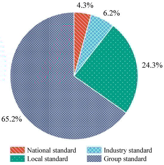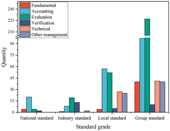 At different levels, there are minor variations in the composition of standards. Generally, accounting standards and evaluation standards predominate (Figure 6). Before 2023, national standards only encompass two types, accounting and evaluation, leaving other categories blank. In 2023, the verification and fundamental standard types are supplemented. Industry standards do not include technical standards, while verification standards are a significant category within industry standards, outnumbering local and group standards. Local and group standards cover all categories with slight differences in distribution. In local standards, other management standards and technical standardization are more numerous than in group ones; conversely, fundamental standards’ numbers in group standards exceed those in local ones. Overall, the group standards stand out for their proportions of fundamental, accounting, and evaluation standards; the industry category leads in verification standards, while the local category dominates in its proportions of technical and other management standards.