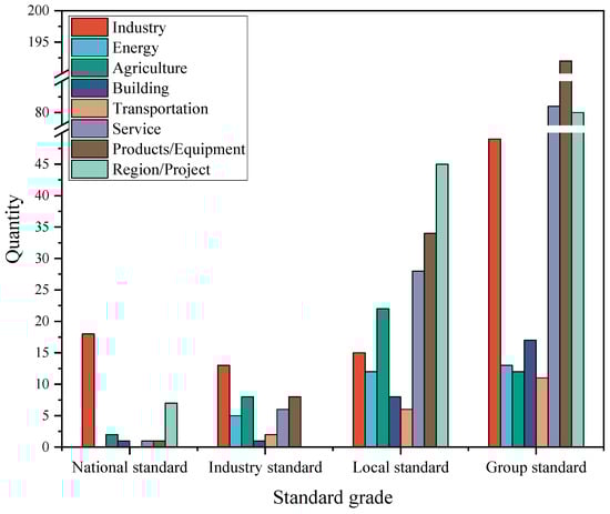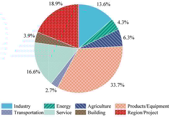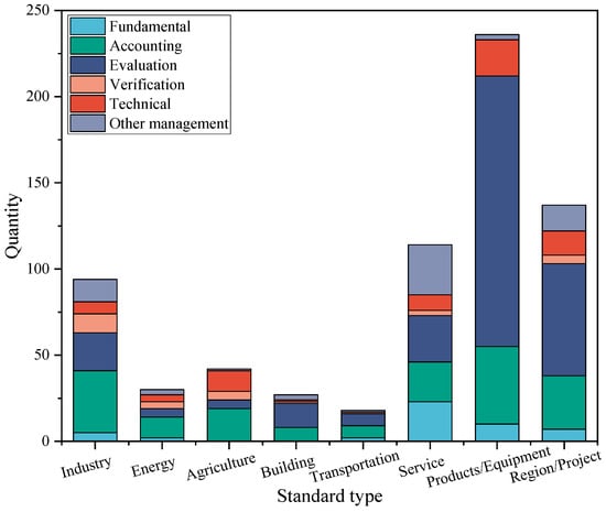 According to the application scope defined by standards, this study categorizes standards into eight types: industrial sector, energy, agriculture, building, transportation, service, products and equipment, and region and project. The industrial sector, energy, agriculture, building, and transportation standards apply to enterprises and encompass carbon emission accounting standards, verification standards, evaluation standards, low-carbon technology standards, etc. Service standards are widely utilized across various enterprise types, such as carbon asset management, carbon trading, and finance-related activities. Product/equipment standards pertain to individual products or equipment, including carbon footprint quantification standards, low-carbon evaluation standards, etc. Region/project standards apply to cities, parks, and communities, including low-carbon operation guidelines and project-based greenhouse gas emission reduction accounting principles. Based on the above-mentioned classification system, the existing standards were subjected to statistical analysis, as depicted in Figure 7.