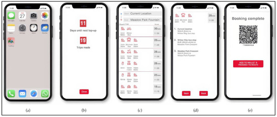 A control app was designed to mimic the functionality of a real smartphone app, allowing participants to navigate via clickable buttons and menus to search for and select a chosen route (Figure 1). The simulation started with a phone home screen featuring the Tix2Ride app icon. Within the app, the home screen featured the journey booking page with input boxes for start and destination, along with a clickable profile icon. The profile page provided a summary of trips and top-up timing; the search results page listed six available routes, with options to view details for each. Route options were listed with green and grey routes alternating, and trip duration was emphasized above arrival time (Figure 1c). The journey option pages provided detailed information about the selected route, with options to book or return to the results page. Finally, the booking page confirmed the selection and concluded the task.