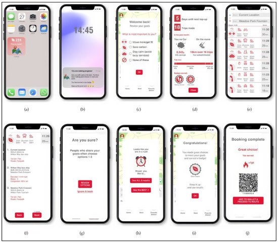 Screen images from intervention condition app (including BCTs): (a) phone home screen with “widget” button emphasizing points from past engagement; (b) notification showing congratulatory messaging and prompting self-praise; (c) goal-setting/review pop-up; (d) pop-up/profile page providing feedback on behavior and outcomes; (e) results page showing goal- and outcome-relevant icons; (f) route detail page providing information to remove uncertainty (e.g., bike dock availability, walking route incline, etc.); (g) prompt to review choice in line with goals and behaviors of relevant others; (h) option to reduce route options to conserve mental resources; (i) congratulatory messaging and reward (badge); (j) booking confirmation reinforcing choice and awarding a point.