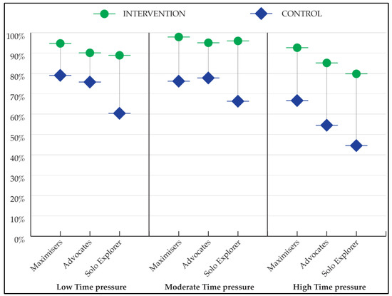 Descriptive analyses revealed that participants in the intervention condition consistently selected green routes more frequently than those in the control condition across all segments and time pressure levels. Maximizers were the most likely to choose green routes under all time pressures and conditions, except in the control condition at moderate time pressure, where marginally more Advocates selected a green route. Solo Explorers were the least likely to choose green routes under all time pressures and conditions, except in the intervention condition at moderate time pressure, where they were marginally more likely than Advocates to select a green route. Across all segments and conditions, green bookings were highest at moderate time pressure, except for Maximizers in the control condition, who showed greater levels of green bookings at low time pressure. These patterns are summarized in Table 4 and visualized in Figure 3.