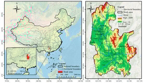 The Li River Basin, situated in the northeastern Guangxi Province at the southern terminus of the Xiang-Gui Corridor, encompasses an area of 12,141.611 km2 (Figure 1). The Li River originates in the eastern Mao’er Mountains of the Yuecheng Ridge, part of the Nanling Mountains in northwest Guangxi. The upstream merges with the Xiaorong, Chuan, and Huangbai Rivers at Rongjiang Town to form the Darong River. From the Lingqu Canal onward, it is referred to as the Li River. Downstream, the river converges with the Lipu and Gongcheng Rivers in Pingle County, becoming the Gui River. Its major tributaries include the Taohua, Xiaodong, Gantang, and Xiangsi Rivers. As the golden waterway driving the development of Guilin’s tourism industry [45], the Li River Basin spans several key counties and urban areas, including Xing’an County, Lingchuan County, Diecai District, Qixing District, Xiufeng District, Xiangshan District, Yanshan District, Lingui District, Yongfu County, Yangshuo County, Gongcheng County, Lipu City, and Pingle County. The Li River Basin lies within a subtropical monsoon climate zone, characterized by mild temperatures and plentiful precipitation. The region’s topography is dominated by karst landscapes, with elevated areas surrounding it and lower-lying regions at the core. The northern area consists of medium-to-high mountains and hills, while the central regions predominantly feature a landscape of low mountains, hills, and karst rocky peaks. Additionally, the Li River Basin forms part of the World Natural Heritage Southern Karst Core Protection Area. It is a nationally significant ecological function zone and plays an integral role in China’s “Two Screens and Three Belts” ecological security strategy [46].