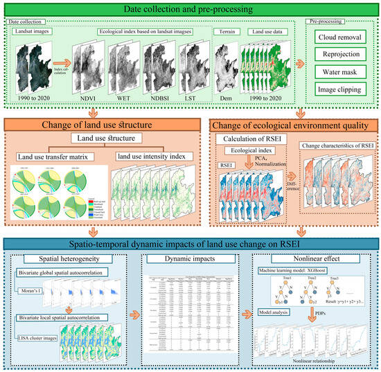 Figure 2 presents the research framework. The acquired data underwent several pre-processing steps, including cloud removal, water mask, coordinate projection, and clipping. Subsequently, the processed data were utilized to calculate the LUC transfer matrix, LUI, and RSEI. Finally, we analyzed the spatial relationships, dynamic impacts, and non-linear effects of LUCC on the RSEI using spatial autoregressive models, differencing analysis, and ML methods.