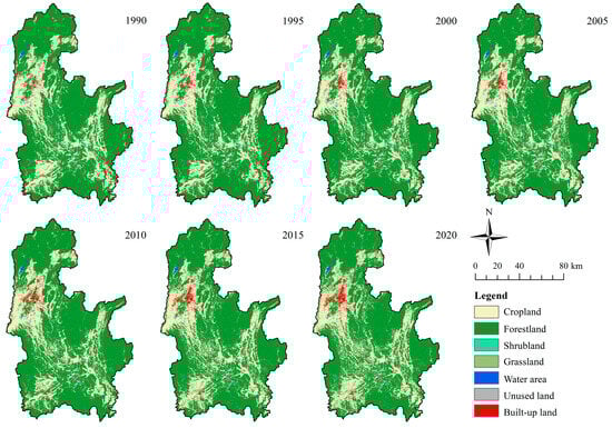 The spatial pattern and LUC area proportions in the Li River Basin from 1990 to 2020 are presented in Figure 3 and Table 3, respectively. In the spatial distribution of LUC, forestland and cropland were the prevalent LUC types, with an average area proportion of 72% and 25%, respectively, over the 30-year period. Forestland was primarily distributed at the edges of the basin and in the mountainous areas of the midstream region, forming a continuous forested landscape that served as the foundation for maintaining the region’s EEQ. Cropland was mainly distributed around built-up land in the midstream and downstream areas. The built-up land was mostly located in the main urban part of Guilin in the midstream, with an average proportion of 1.36%. Notably, built-up land had expanded significantly, increasing from 84.5811 km2 to 262.7226 km2 over 30 years—a growth rate of 210.62%. The expansion primarily occurred in the midstream and downstream areas of the Li River Basin, as well as in a small portion of the northeastern region. Other LUC types accounted for a smaller proportion and are not prominently distributed.