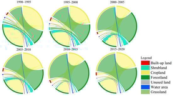 The LUCC Transfer Matrix is a further application of the Markov model in the field of LUCC research. It is mainly used to study the transfer of area between the beginning and the end of LUC types. This matrix can understand the direction of the loss of each LUC type and the composition of LUC types at the end of the period [49]. In this study, we calculated the LUCC transition matrix of the Li River Basin using ArcGIS by processing LUC data from adjacent years. Additionally, to highlight the LUC transitions, we focused only on the conversions between different LUC types during matrix construction, in order to more accurately identify and analyze the main trends and patterns of LUCC. Finally, we visualized the LUC transition matrix using chord diagrams in Origin. The calculation equation is as follows [50]: