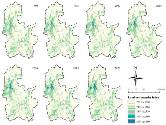 The LUI index directly reflects the utilization status of LUC, serving to explain the degree of human activity interference with the land [51]. In this study, we constructed a 700 m × 700 m grid and calculated the LUI to measure the intensity of land development in the Li River Basin. The equation is as follows [52]: