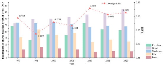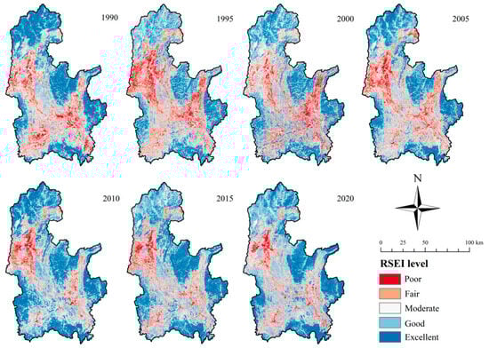 After obtaining RSEI 0 , we applied the same Min-Max Scaling method to normalize it, and the final RSEI value range from 0 to 1. The closer the RSEI value is to 1, the higher the grade of EEQ; conversely, the farther from 1, the lower the quality. In addition, when the first principal component (PC1) has negative values for NDVI and WET and positive values for NDBSI and LST, it is necessary to use the formula “1-PC1” reduction index [60]. Finally, the RSEI was categorized into five grades: poor (0–0.2], fair (0.2–0.4], moderate (0.4–0.6], good (0.6–0.8], and excellent (0.8–1]), which facilitate the evaluation of EEQ in the study area [61]. The equation is as follows: