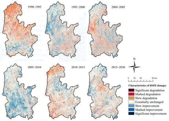 Table 6. Area (A/km2) and proportion (P/%) of RSEI change characteristics from 1990 to 2020.
