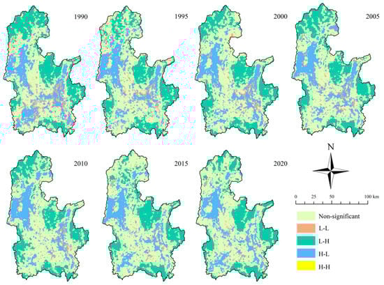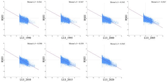 The bivariate spatial autocorrelation model is capable of assessing the effects of variables in areas and their neighboring regions and explain the spatial correlation between them [62]. In this study, we constructed a grid of 700 m × 700 m for the RSEI. Then, we calculated the average RSEI within each grid, which facilitated the analysis in combination with the LUI. Through the bivariate global spatial autocorrelation model, we analyzed the spatial correlation and significance of the LUI and RSEI. Additionally, we employed the Local Indicators of Spatial Association (LISA) cluster diagram to identify the spatial clustering characteristics between them, revealing the spatial distribution patterns of LUI and EEQ within the Li River Basin. This analysis preliminarily explores the spatial impact of LUCC on EEQ. The specific equations are described as follows [11].