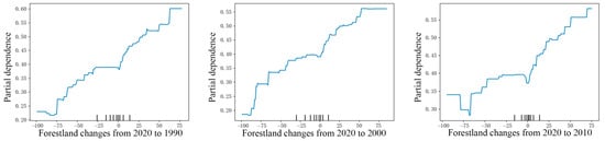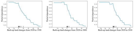 XGBoost is an ensemble learning algorithm that combines multiple decision trees, iteratively training a series of weak learners to progressively enhance the model’s performance [64]. It has been increasingly employed in ecological studies due to its robustness and flexibility. In this study, we applied XGBoost to analyze the impact of LUCC on the RSEI and identify non-linear characteristics and critical inflection points in their relationship. During the calculation process, to accurately explore the effect of LUCC, we further constructed a 300 m × 300 m grid and calculated the area proportion of each LUC type and the average RSEI within the grids. Ideally, each grid should contain all LUC types. When a grid lacks a certain LUC type, the data table will contain null values, rendering them unusable for model training. However, due to significant variations in LUC distribution across the Li River Basin, grids that encompass all land use categories are limited. Consequently, we selected grids that included forestland, cropland, and built-up land to reflect better the LUCC caused by human activities while minimizing the interference of natural factors. To reflect the dynamic impacts of LUCC, we analyzed three time periods: 2020–2010, 2020–2000, and 2020–1990. This approach ensures that the results are both continuous and precise [65]. Ultimately, the changes in the area proportion of LUC types within each grid were set as independent variables, while the average RSEI was set as the dependent variable to analyze their non-linear relationship and detect threshold effects. The equation formula is as follows [66]: