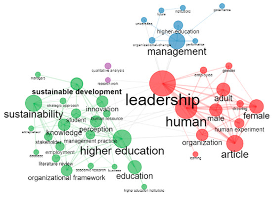 Figure 1 is a visualization from Biblioshiny, showing the network analysis of keyword clusters using Keywords Plus to observe the networks formed. The processing resulted in four network clusters (red, green, blue, and purple), showing the proximity and strength of links between keywords, as indicated by label size and the distance between nodes. The conclusions drawn from the four clusters suggest that organizational change and leadership are firmly related, and leadership also has a strong relationship with universities. A smaller cluster emerged focusing on qualitative analysis related to leadership, supporting the notion that this research can be conducted using qualitative analysis. However, Sukoco et al. [