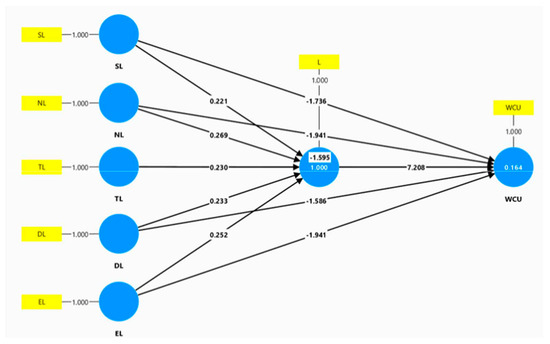 The path coefficient value of −1.941 is smaller than the p-value of 0.027. This indicates that NL has a negative and significant influence on WCU status, with a coefficient of −1.941. Therefore, when NL increases, it will reduce WCU status and vice versa.