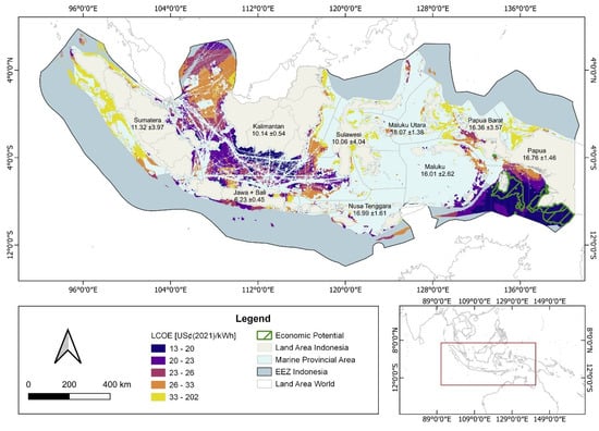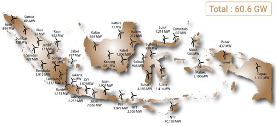 Table 2 shows the wind energy potential in 34 provinces. The potential is measured in MWs and is divided into onshore and offshore locations. Among the provinces, several show notable wind energy potential. In East Nusa Tenggara, the onshore and offshore potential is 10,188 MWs and 1836 MWs, respectively. Similarly, East Java showcases a significant onshore potential of 7907 MWs and an offshore potential of 2297 MWs. West Java follows closely with an onshore and offshore potential of 7036 MWs and 5691 MWs. Central Java showcases an onshore and offshore potential of 5213 MWs and 3347 MWs, respectively. Provinces such as South Sulawesi, Maluku, West Nusa Tenggara, Banten, Southeast Sulawesi, Papua, and North Sulawesi also possess significant wind energy potential both onshore and offshore. The total wind energy potential across all provinces amounted to 60,647 MWs (Figure 1) and 94,231 MWs for both onshore and offshore potential [10,28].