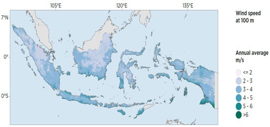 Figure 2. Wind speed at 100 m potential in Indonesia [32]. Copyright 2022, IRENA.