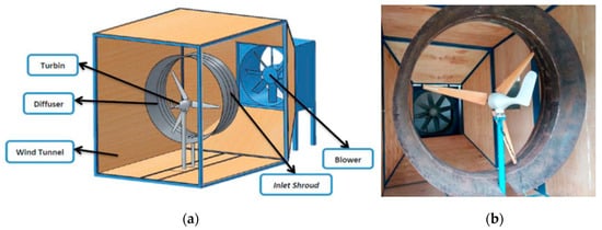 Figure 8. (a) Wind tunnel design; (b) wind turbine with diffuser [53].