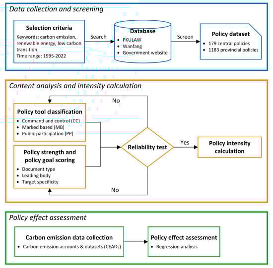 Figure 1 depicts the research methods used, divided into three sections: data collection and screening, content analysis and intensity calculation, and policy effect assessment. First, carbon reduction-related central and local policies were searched, collected, and screened from multiple data sources. Following that, policy documents were classified, policy strength and goals were scored, and policy intensity was calculated. Finally, the policy effect was assessed using regression analysis to quantify its impact on carbon emissions.