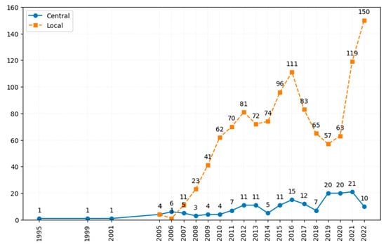 To ensure a rigorous and uniform application of the carbon reduction policy classification criteria and scoring standards, three experts were thoroughly briefed on the methodology, with any ambiguities clarified through discussion. Initially, fifty policy texts were randomly selected for classification and scoring by the researchers. Discrepancies in their assessments were resolved through consensus-building discussions. This process was repeated with another set of fifty environmental policy texts, achieving classification and scoring consistency rates of 86% and 90%, respectively. After addressing any areas of disagreement, the researchers proceeded to classify and score the entire dataset of 179 central and 1183 local policies. The final assessment yielded high consistency rates of 94.4% and 98.9% for central policy classification and scoring, and 98.5% and 99.4% for local policy classification and scoring, respectively. These high levels of agreement, surpassing the 80% threshold, confirm the results pass the reliability test and are, therefore, acceptable [,].