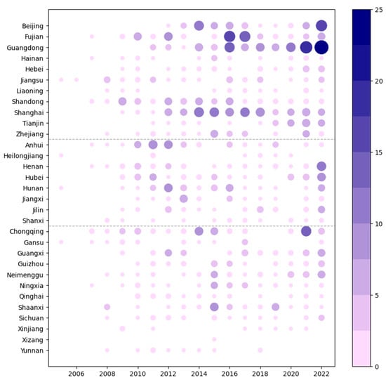 PP policies, in comparison with the other two policy types, are less prevalent in both quantity and intensity. This observation is consistent with findings from Luo and Zhu [], who analyzed Chinese low-carbon policy texts, highlighting a similar trend. The effectiveness of PP policies varies widely across provinces, shaped by differences in socioeconomic development, public awareness, and civic engagement capacity, as shown in Figure 5. Economically developed and urbanized provinces such as Beijing, Shanghai, and Guangdong demonstrate a stronger impact of PP policies, supported by a more informed public, better access to technology, and greater backing for environmental initiatives. In contrast, central and western provinces face challenges such as lower public awareness, limited access to information, and weaker civil society networks. Additionally, a lack of transparency in carbon data and limited platforms for public participation further constrain the effectiveness of PP policies in these regions. The importance of public support in climate policy efficacy cannot be overstated, as the absence of public involvement in the policymaking process can lead to resistance towards such initiatives []. The public’s engagement with dual carbon issues plays a crucial role in addressing governance limitations, potentially offsetting governmental shortcomings []. Research indicates that public awareness and concern for environmental issues significantly contribute to environmental improvements across both developed and developing nations [,]. Enhanced information technology has further facilitated public engagement in environmental governance.