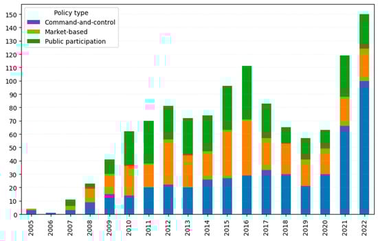 However, as shown in Figure 4, CC policies still dominate China’s carbon reduction strategy. Consequently, there is an increasing call for the Chinese government to gradually shift away from reliance on CC policies and toward more flexible, non-coercive policy instruments, with greater emphasis on coordinating different policy tools to achieve better environmental outcomes [,].