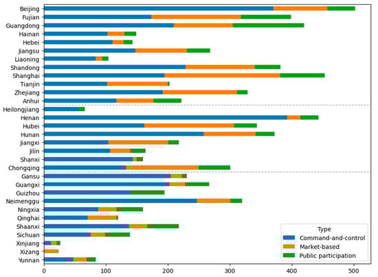 MB policies are less prevalent than CC policies, both in their numerical count and in average intensity. This observation aligns with the analysis by Luo and Zhu [], who, through a quantitative examination of China’s low-carbon policy documents, deduced a similar pattern. Despite their lower frequency, MB policies offer a dynamic and flexible approach to reducing emissions, leveraging economic levers and monetary incentives to encourage polluters towards emission reduction []. In contrast, CC strategies have been critiqued for their potential to deter technological innovation and investment [].
