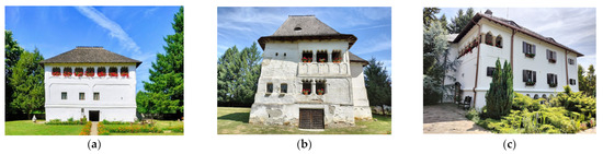 Romanian culas are simplistic large villas for boyar families from the 16–18th centuries [56], located mainly in the Subcarpathian hills in West Muntenia and Oltenia regions, such as Măldărești, Vâlcea County. The culas in this village, documented by the first author on a field trip in 2023, are different in size, form, and appearance, as shown in Figure 5a (according to Ionescu [57], the new cula, 18th century), b (according to Ionescu [57], the old cula, also 18th century), and c (converted to a hotel) for Măldărești, with larger white-plastered buildings with generous openings on the upper floor, as well as in Figure 5e, showing a construction with no plaster in the Râmnicu Vâlcea village museum. While a and b are visitable as museums, c was converted into a hotel.