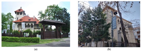 The cula motif as a tower was also adopted by the Romanian variation in Art Nouveau, the New Romanian style. Valentin Mandache documented some from the architectural tours he guided [68]. One renowned example is the Vila Minovici, belonging to the Museum of Bucharest (Figure 8a). In fact, the upper so-called prispă, the loggia of the cula, sometimes presents the same Brâncovenesc origin of a three-lobed arch, which was typical for the New Romanian style.