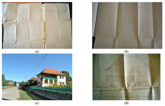 Drawn building surveys are a different source for further work on existing built substances (ex. designing retrofit interventions) than the authorisation plans shown in Figure 8 and Figure 9 or the architects’ plans in archives such as, for example, at the Canadian Centre for Architecture. See Blau [77] for how the so-called “collection” at the Canadian Centre for Architecture is built. Also, the digital humanities centres in Rome house the collections of such surveys conducted by the Rome fellows of other academies. For example, the American Academy in Rome has several different such historic drawings (with trees, without trees) of the gardens of villa Gamberaia in Florence, while contemporary ones were carried out for the restoration in frame of PNRR project 2023–2024. While today, building surveys are performed with computer support in order to obtain BIM models from point cloud laser scanning or Disto, which is easier, several decades ago, the first author participated in building surveys in Karlsruhe, Nierstein, on the Rhine (the river Rhine will be a subject in a future paper) (Figure 12c,d) and in Myslakowice (Poland) (Figure 12b) using a method by hand. First a reference line was traced on the ground, with reference points at each metre. Then, each corner point of the surveyed building was measured out of three reference points. These distances were drawn with a compass on work power and had to meet at one point. After this, the corners were bound with a lineal on the work paper. For the final drawing, however, calc (translucent paper used for the approval plans) was put over these working drawings and India ink was used freehand to draw the lines with tremor because historic buildings do not have straight surfaces. The advanced building survey of a textile factory in Myslakowice (in the mountains close to Wroclaw) (Figure 12b) was conducted in frame of the Collaborative Research Centre (SFB) 315 Preserving historically relevant buildings, the subproject of The building survey as research method in the history of architecture (Häffner [78,79]), and it was showcased at the first alumni meeting of the University of Karlsruhe, its anniversary of 175 years, in 2000.