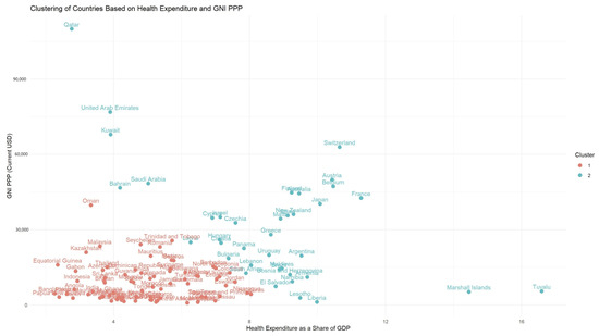 Distribution of clustered countries based on health expenditure as a share of GDP and GNI PPP.