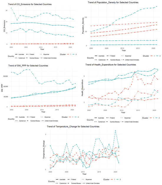 Figure 2 presents the trends for the CO2 Emissions, Population Density, GNI PPP, Health Expenditure, and Temperature Change variables for six randomly selected countries (three from Cluster 1 and three from Cluster 2) during the period 2000–2021.