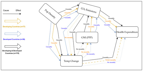 The causal relationships between carbon emissions, temperature changes, and health expenditures differ between developed and developing countries due to variations in economic structures, environmental policies, health system capacities, and adaptation abilities. In developed countries, environmental risks are often mitigated through effective policies, renewable energy use, and robust health infrastructures. In contrast, developing countries experience more pronounced effects due to reliance on fossil fuels, the environmental costs of industrialization, and limited resources. In these countries, the direct burden of temperature increases on health systems is more acutely felt due to weaker infrastructure and lower adaptation capacities. Meanwhile, in developed countries, the capacity of individuals and governments to adapt and respond to environmental changes is higher, which can make the impact on health expenditures more indirect or limited.